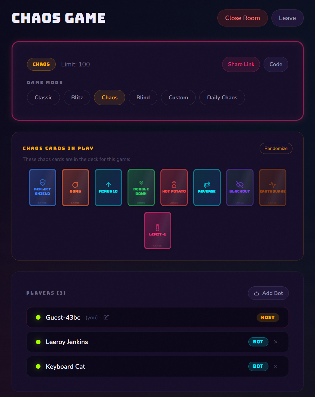 - Daily Chaos — 3 rotating wild cards mixed in, changes every day
