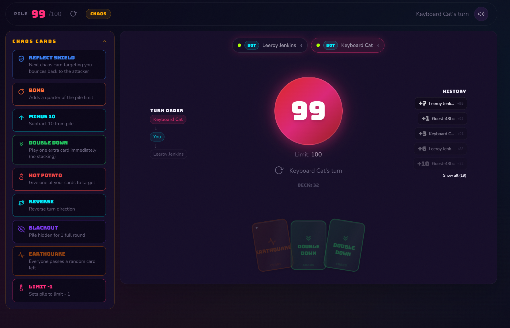 - Chaos Cards (Premium) — Instant 99, Snipe, Bomb, Shield, Mirror, Freeze & more