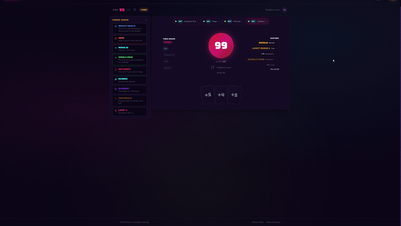 CENTRY is a fast, strategic multiplayer card game you play in your browser. Take turns adding cards to a shared pile — but push it past 100 and you're out. Last player standing wins.